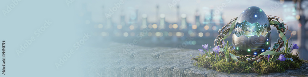 Futuristic cyber Easter egg decorated with crocus and greenery. Digital circuit integrated into egg shell with glowing light. Innovative concept for modern holiday celebration. Banner with copy space #1956708756