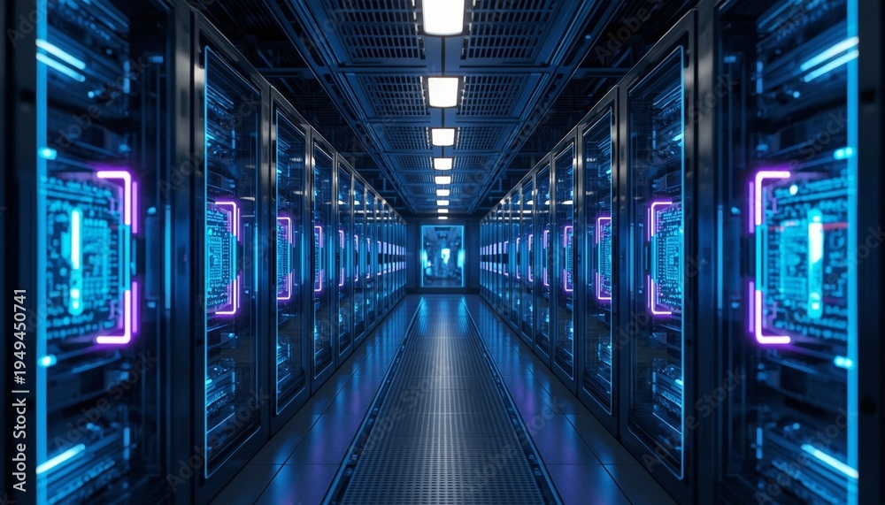 Futuristic Data Center Server Corridor With Glowing Neon Technology Network #1949450741