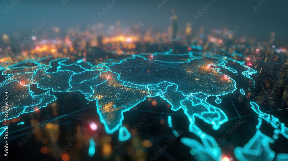 Futuristic digital map of Asia with glowing neon borders and global network data connections #1872661573