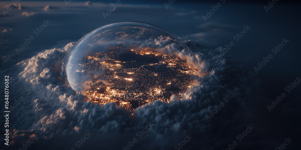 Futuristic dome shield protecting a country at night. Anti-missile defense system above illuminated city under a transparent energy barrier #1648076082