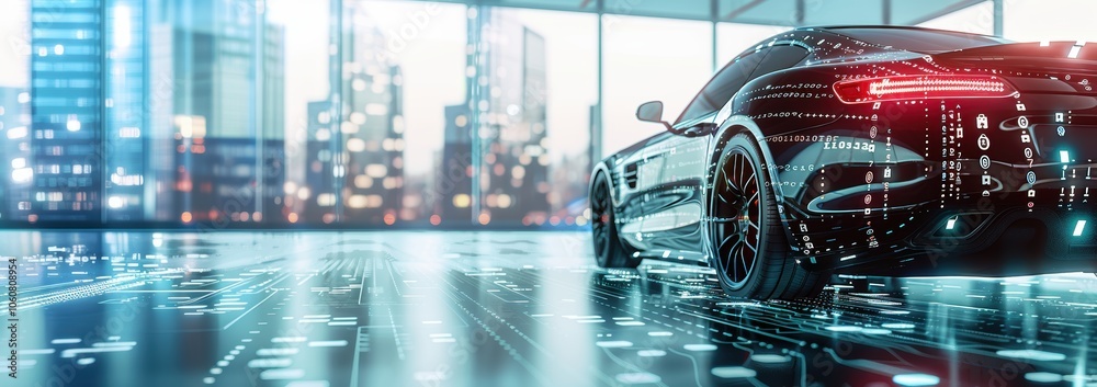 Futuristic sports car with glowing features, parked in a modern urban environment with a city skyline in the background, reflecting high-tech innovation. #1060808954