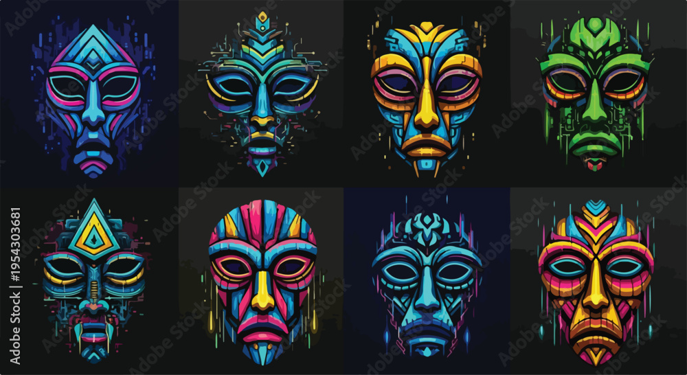 Futuristic tribal mask pack, 9 masks combining tribal motifs with glitch and cyber elements, neon colors, dark background, high contrast vector #1954303681