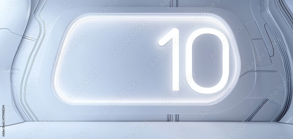 futuristic white wall featuring a glowing number ten (10), reflecting minimal sci fi architecture and modern innovation in digital form #1791488254