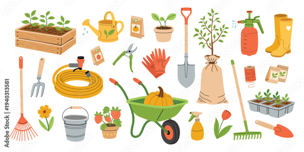Gardening tools and plants collection. Garden equipment, watering can, wheelbarrow, seedlings, shovel, rake, boots. Spring garden elements set. Flat vector illustration isolated on white background. #1940313581