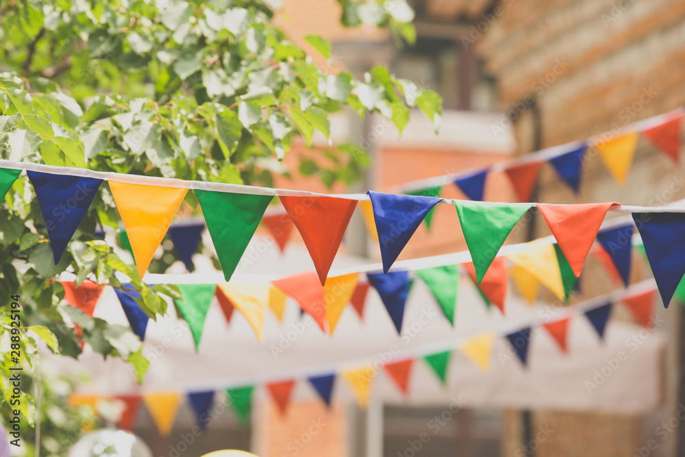 Garland decoration at the fair. Decorations of colorful pennants and colorful flag of the festival. Strings with flags #288925194