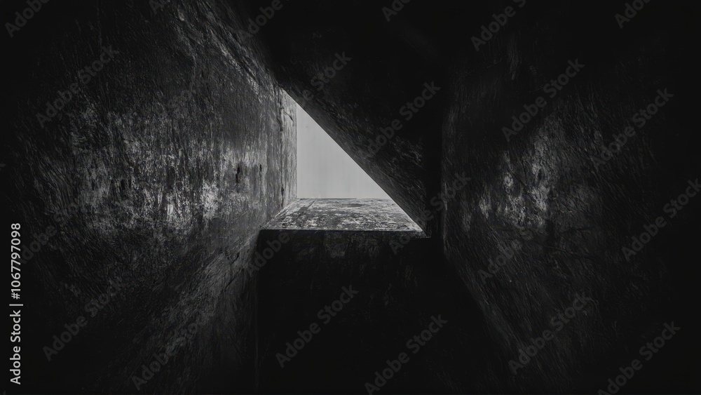 Generative AI, Dark, dramatic black-and-white architectural photograph of towering concrete walls with minimal light and sharp geometric contrasts #1067797098