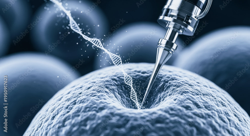 Genetic engineering and biotechnology concept showing a needle injecting DNA into a cell for medical research. #1950917623