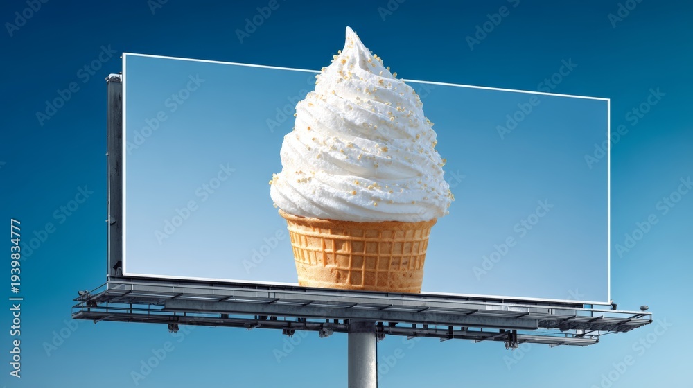 Giant ice cream cone on billboard against blue sky with clean design and space for text in bright sunlight #1939834777