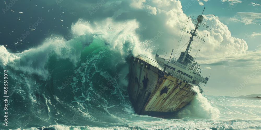 Gigantic tsunami wave engulfs ship during stormy weather #856313013