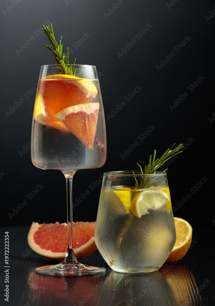 Gin tonic with ice, rosemary, lemon, and grapefruit on a black wooden table. #1972222354