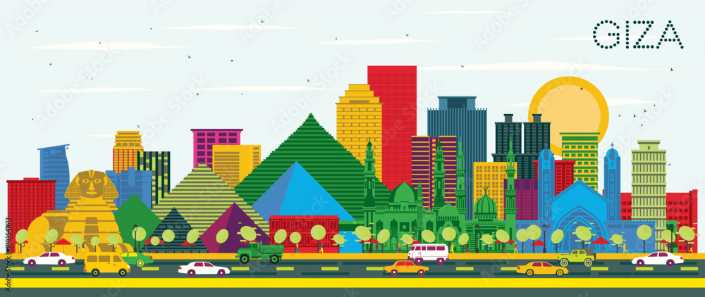 Giza Egypt City Skyline with Color Buildings and Blue Sky. Illustration. Business Travel and Tourism Concept with Historic Architecture. Giza Cityscape with Famous Landmarks. #1803541613