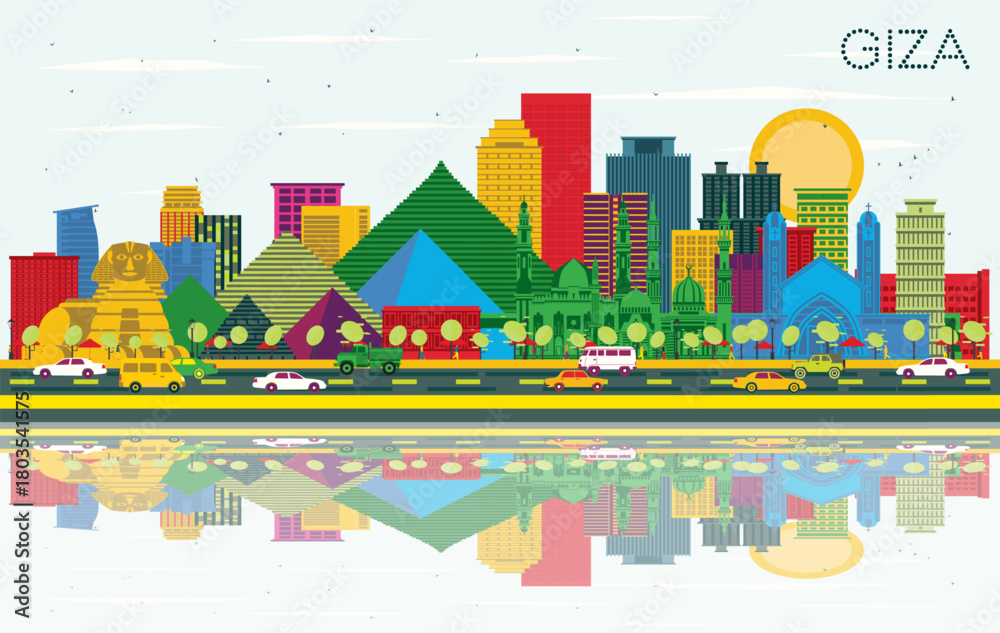 Giza Egypt City Skyline with Color Buildings, Blue Sky and Reflections. Illustration. Business Travel and Tourism Concept with Historic Architecture. Giza Cityscape with Famous Landmarks. #1803541575
