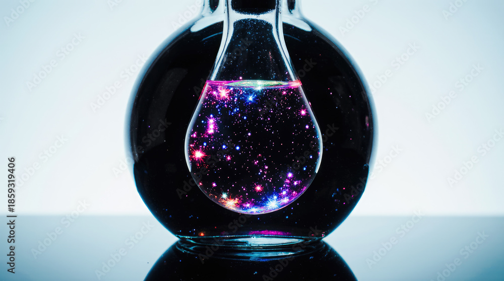 Glass flask filled with dark liquid containing a vibrant galaxy of stars, creating a mystical atmosphere, perfect for science fiction and fantasy themes, showcasing the beauty of the universe #1859319406