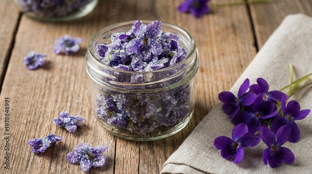Glass jar of lavender sugar on rustic wooden table, scattered lavender buds and fresh purple flowers beside linen cloth, calm natural aromatherapy mood #1978848991