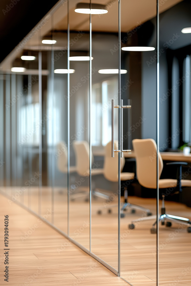 Glass office wall modern workspace meeting room glass door sleek handle wood floor natural light minimalist design contemporary interior corporate environment #1793094036