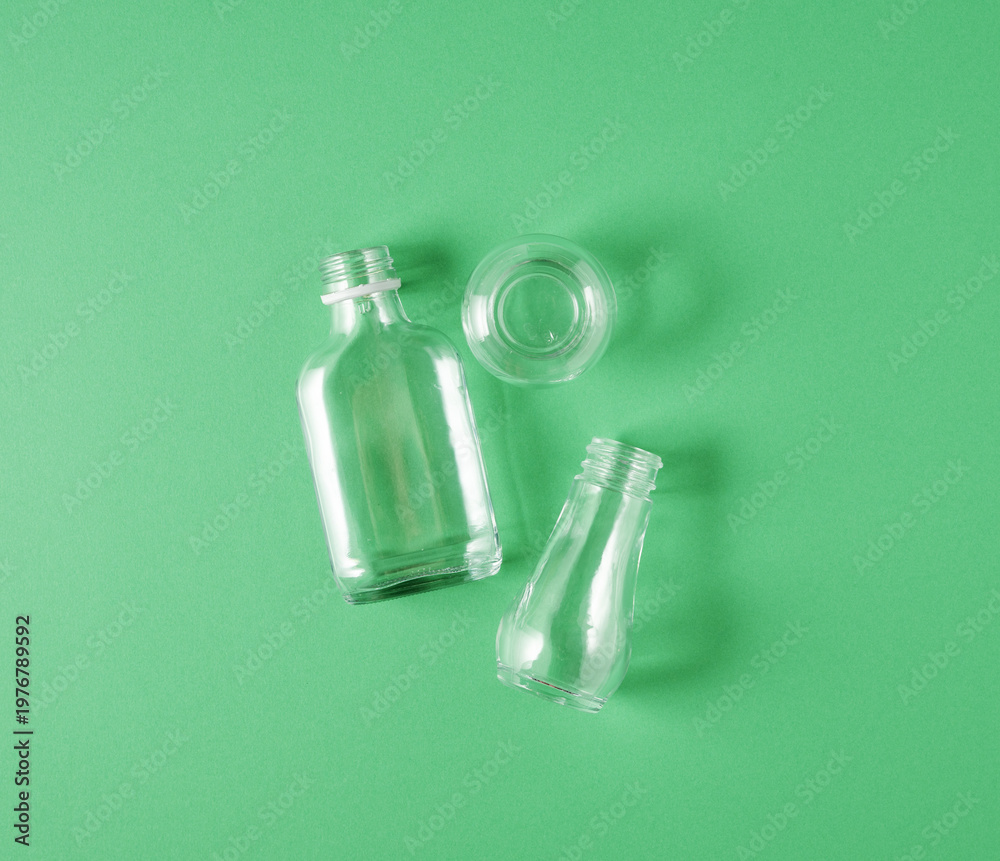 Glass waste on green background, recycling concept. Concept of eco friendly waste sorting, environmental protection, and sustainable living. #1976789592
