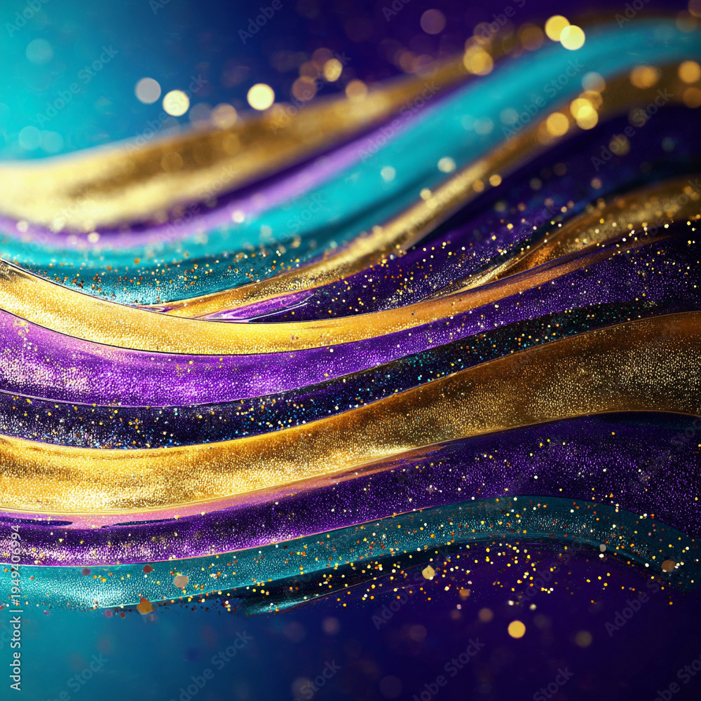 Glitter Teal Violet Golden Wave Stripes Design. Sparkle Motion Lines with bokeh effect background #1949406994