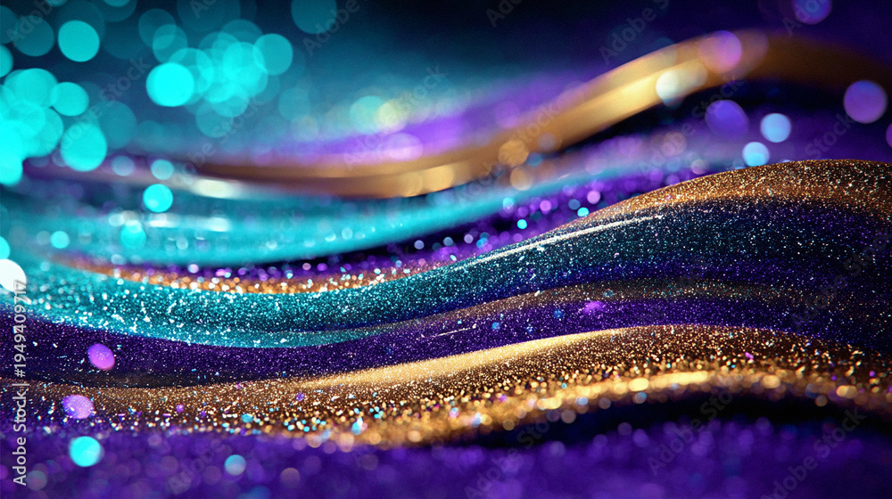 Glitter Teal Violet Golden Wave Stripes Design. Sparkle Motion Lines with bokeh effect background #1949409717