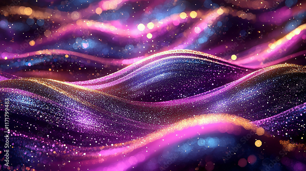 Glitter Violet Blue Gold Wave Stripes Design. Shiny golden moving lines design element on dark background #1171799483
