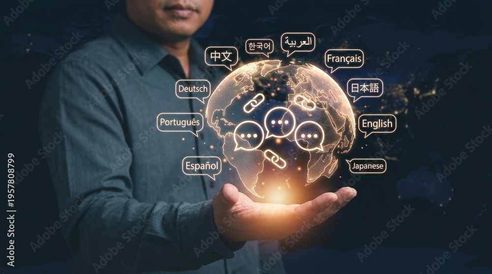 Global communication, language translation, digital networking, world globe, multilingual support, international business, technology interface for globalized business services. #1957808799