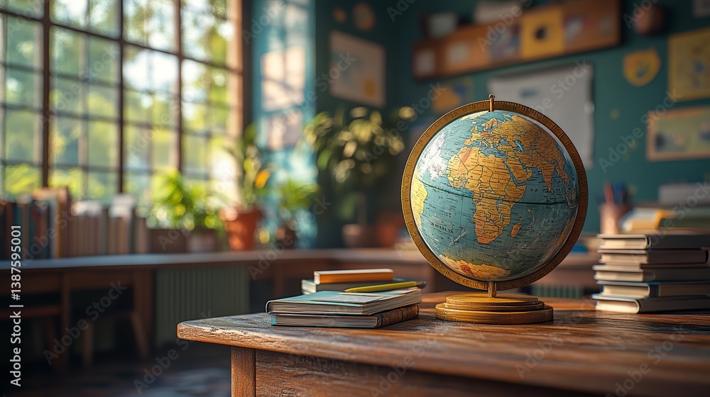 Globe on desk in study room with books and window light for education and geography learning concept #1387595001