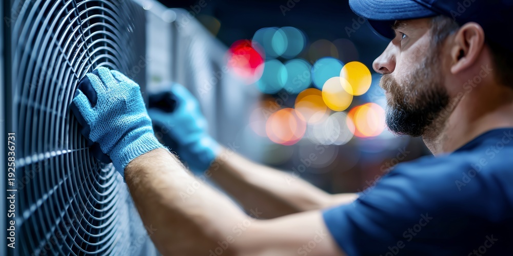 Gloved hands inspecting outdoor AC condenser unit fan #1925836731