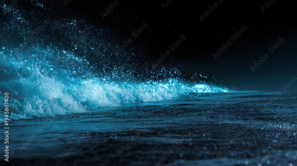 glowing bioluminescent ocean wave crashing on dark beach at night, sparkling blue light in water, magical marine phenomenon under starry sky #1945807400