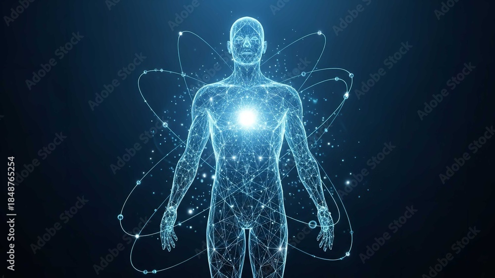 Glowing Blue Human Body with Atomic Structure on Dark Background #1848765254