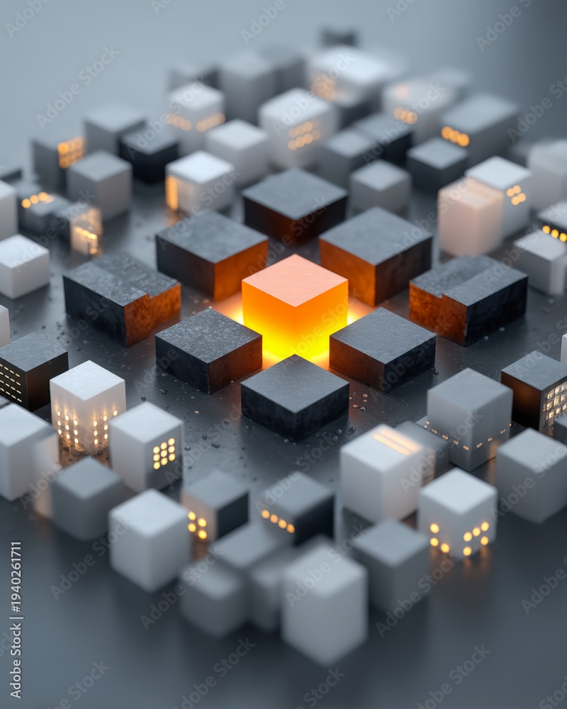 Glowing data integrity cubes circling a central verification core, matte tabletop concept #1940261711