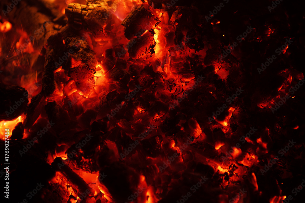 Glowing embers fire background. Burning fire charcoal texture. Hot coals close-up. Fiery pattern. Red hot ashes glowing. Burning embers macro. Fire texture. Fire background. Glowing charcoal. #1769027453