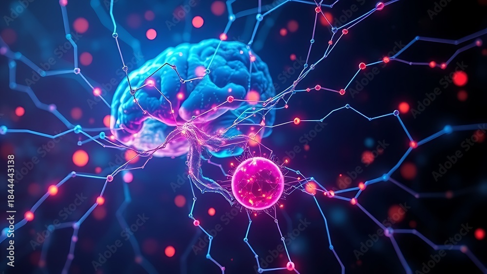 Glowing neural network with floating chemical compounds, representing AI's creative mystery. #1844443138