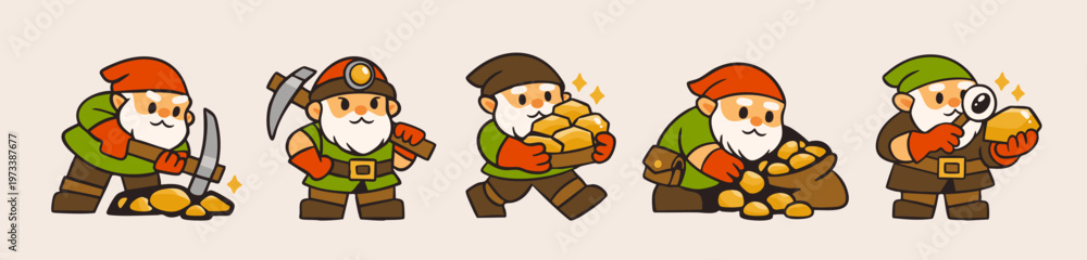 Gnome Miners in various poses. Cute gnomes with pickaxe, helmet, gold nuggets, sack, magnifying glass. Hand drawn Vector illustration. Isolated design elements. Treasure mine, mobile game concept #1973387677