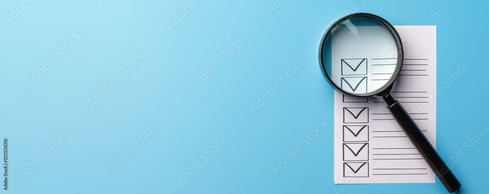 goal setting motivation evaluation concept. Magnifying glass over a checklist on a light blue background. #1231538310