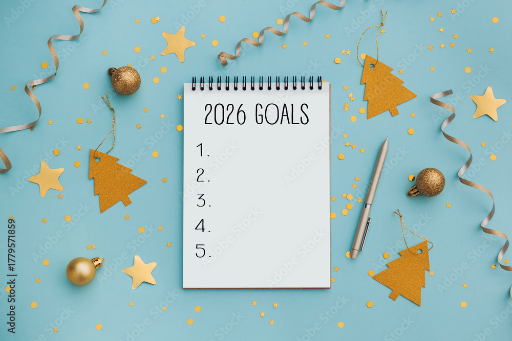 2026 goals list with festive decorations on blue background. Creative New Year planning and resolution, goals, action, checklist, expectations concept. New Year 2026 card #1779571859