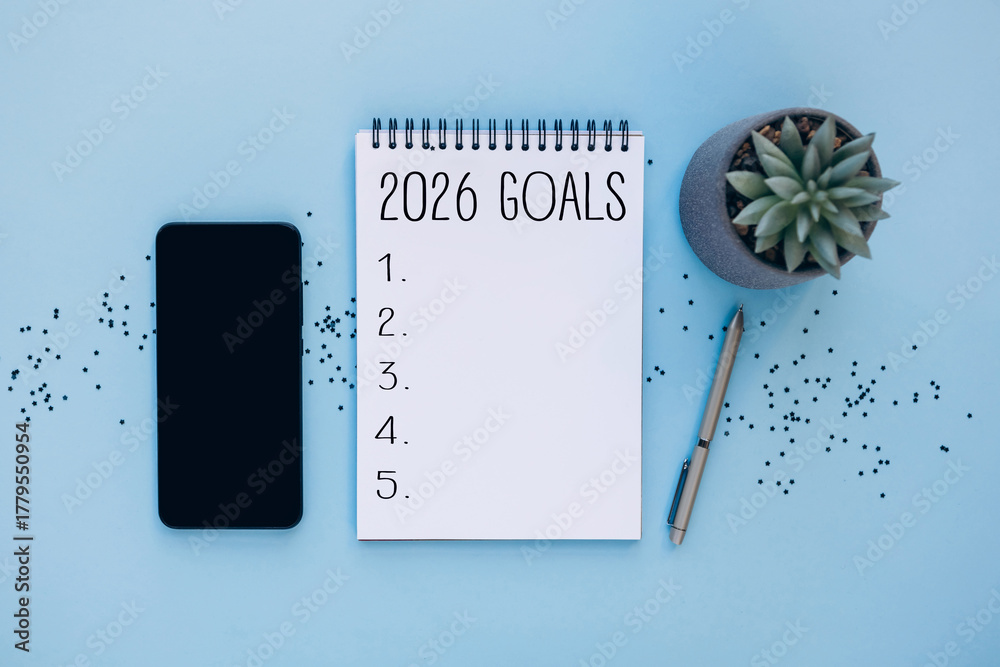 2026 goals planning concept with notebook and accessories. Concept of new year planning, goal setting, resolutions, productivity, personal development, and organization for 2026. #1779550954