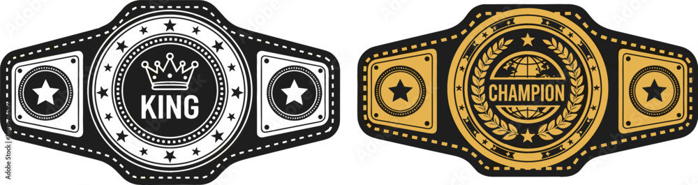 Gold and black championship belt set with king crown and globe champion emblems for sports trophy victory award vector #1887578499