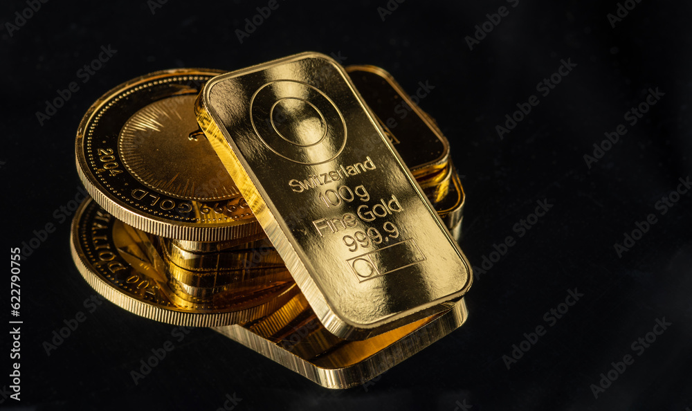 Gold bars and gold coins on a black background. Selective focus. #622790755