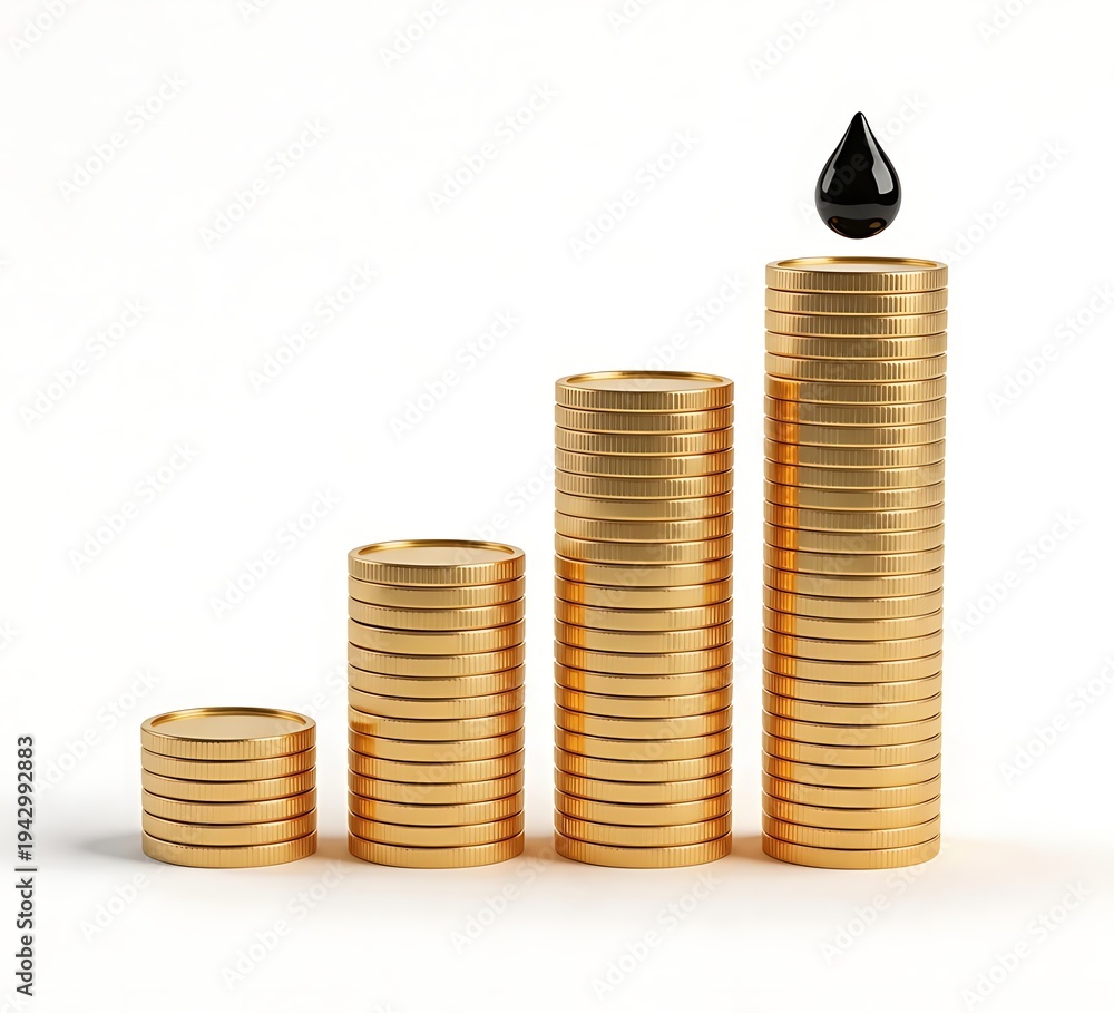 Gold Coin Stack Bar Chart and Floating Black Oil Drop Showing Energy Market Growth #1942992883
