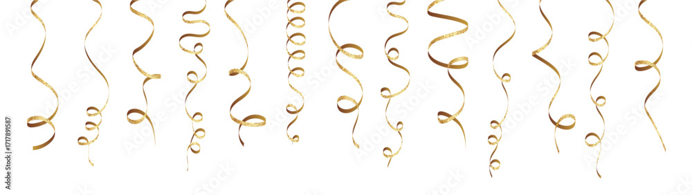 Gold glitter curly ribbon set PNG. Shiny serpentine streamers confetti decoration isolated vector #1717891587