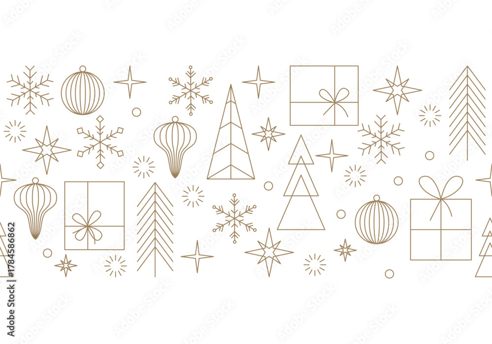 Golden Christmas ornaments seamless vector border. Elegant metallic gold foil effect line art doodle holiday baubles repeating hoorizontal header pattern isolated. Seamless celebration garland #1784586862