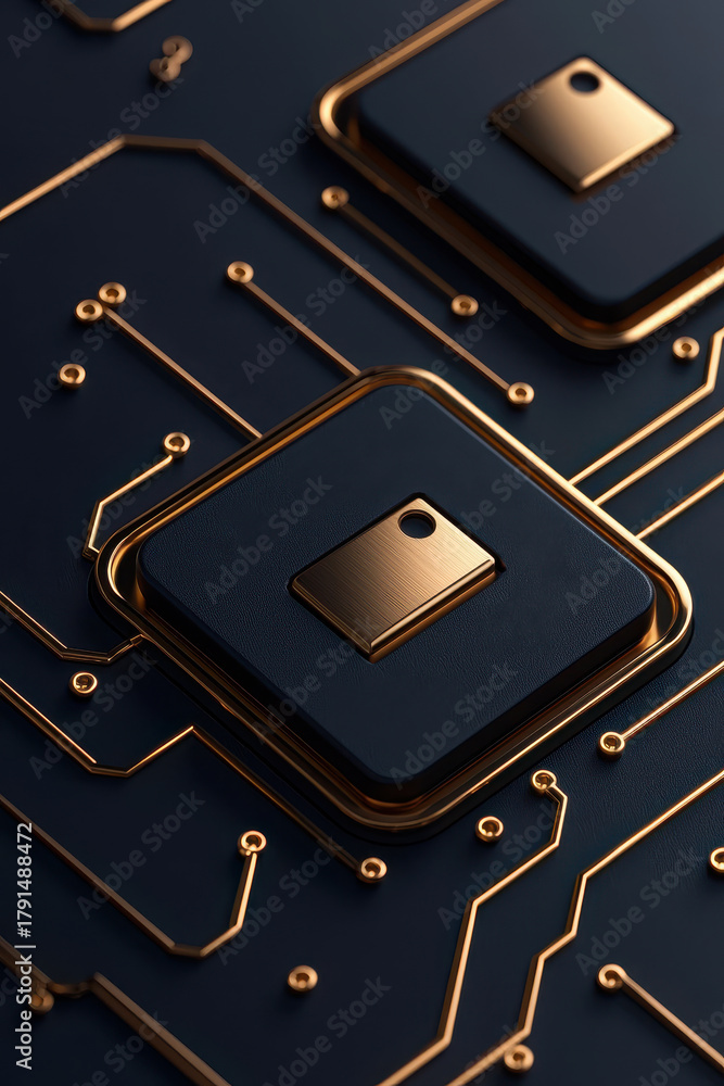 golden circuit chip glowing with metallic precision on dark background, symbolizing AI, innovation, and future technology in a modern digital world #1791488472