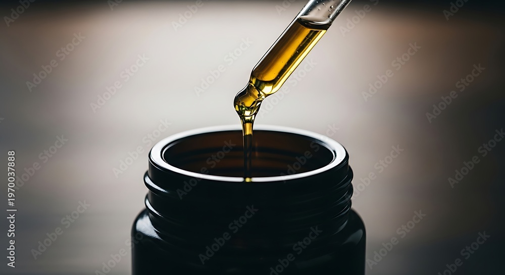Golden essential oil dripping from a glass pipette into a dark amber bottle against a blurred wooden background. #1970037888