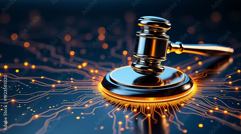 Golden gavel on glowing circuit board, justice concept, legal technology and digital law enforcement with neon highlights #1923581020