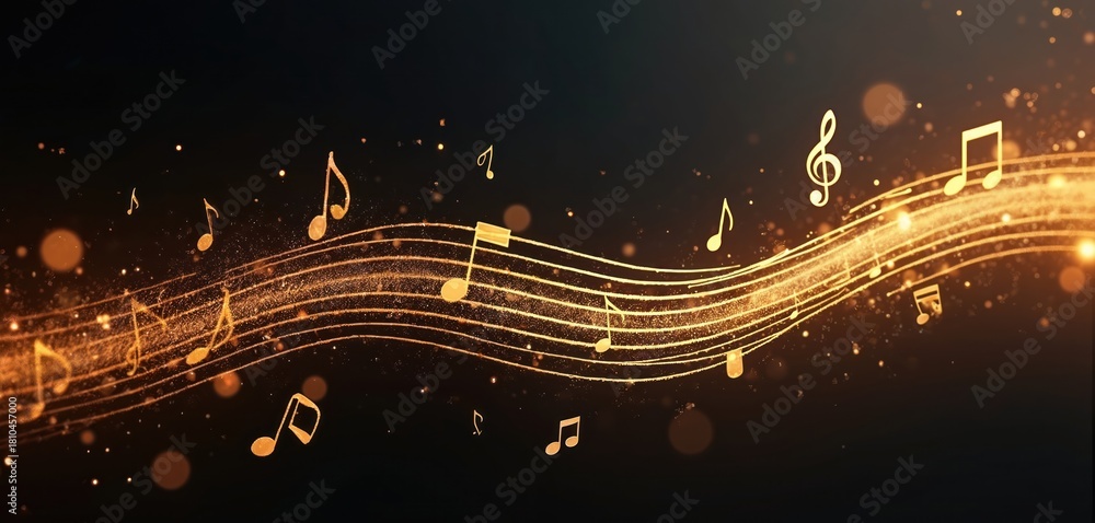 Golden music notes on black background. Musical notes floating on staff. Glowing music symbols. Sparkling particles around. Dark background with shining notes. Wave of music with sparkles. #1810457000