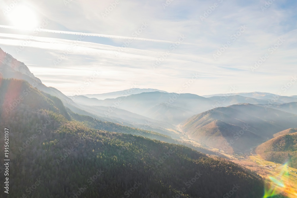 Golden sunlight spills over majestic mountains, illuminating a peaceful valley. Gentle mist weaves through the hills, creating a serene and dreamy atmosphere as the day begins #1915621107