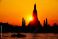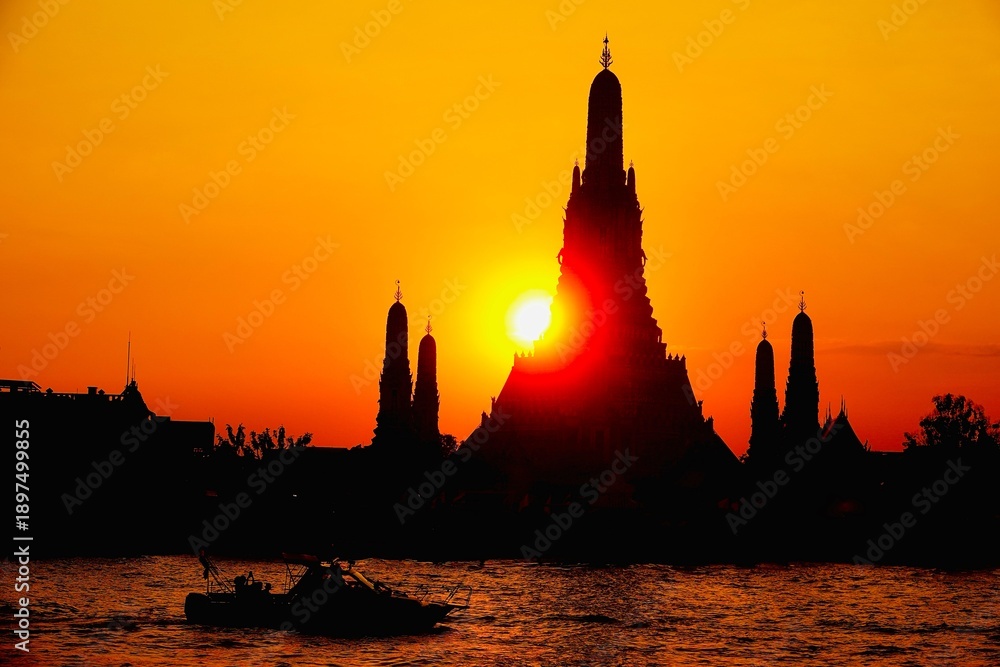 Golden sunset behind the silhouette of Wat Arun temple in Bangkok, reflected on the Chao Phraya River. Dramatic sky, glowing sun, and iconic Thai architecture create a serene, timeless travel scene. #1897499855