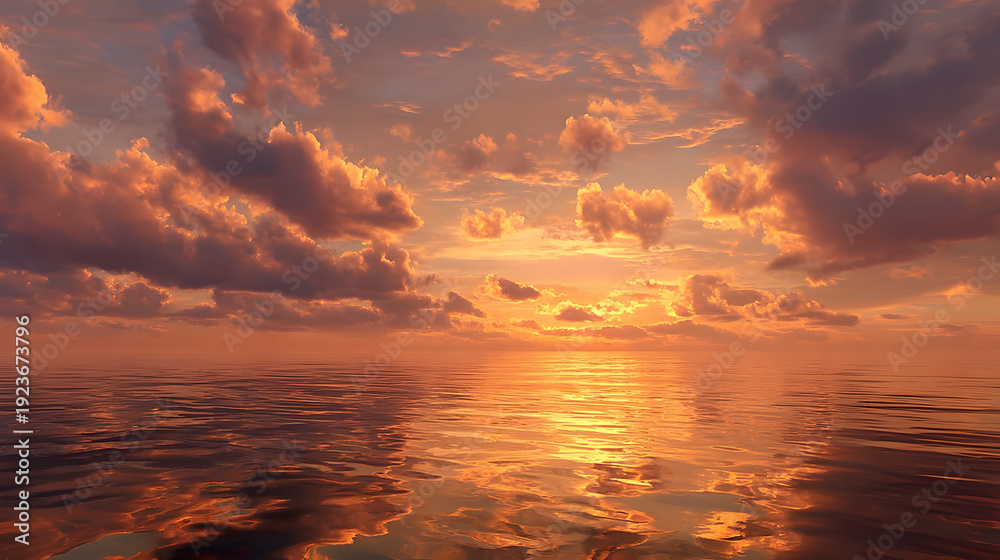 Golden sunset over calm tropical ocean, dramatic sky with orange and pink tones. #1923673796