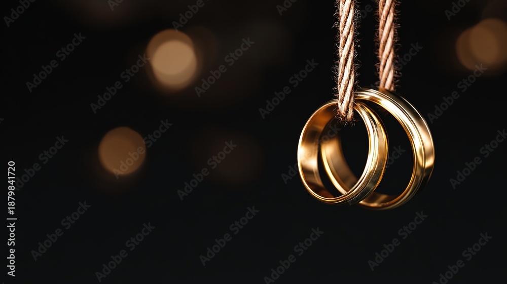Golden wedding rings suspended on a delicate rope, showcasing metallic reflections against a dark background. #1879841720