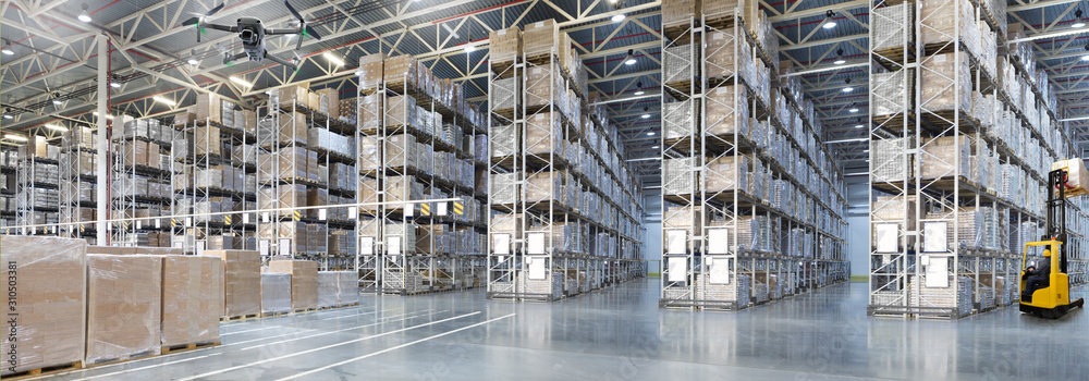 Goods monitoring by Drone in a Huge distribution warehouse with high shelves #310503381