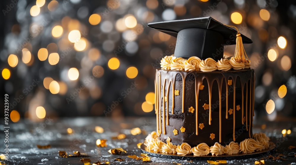 Graduation Cake With Blue Graduation Cap and Gold Stars Displayed in a Modern Event Space #1937323919